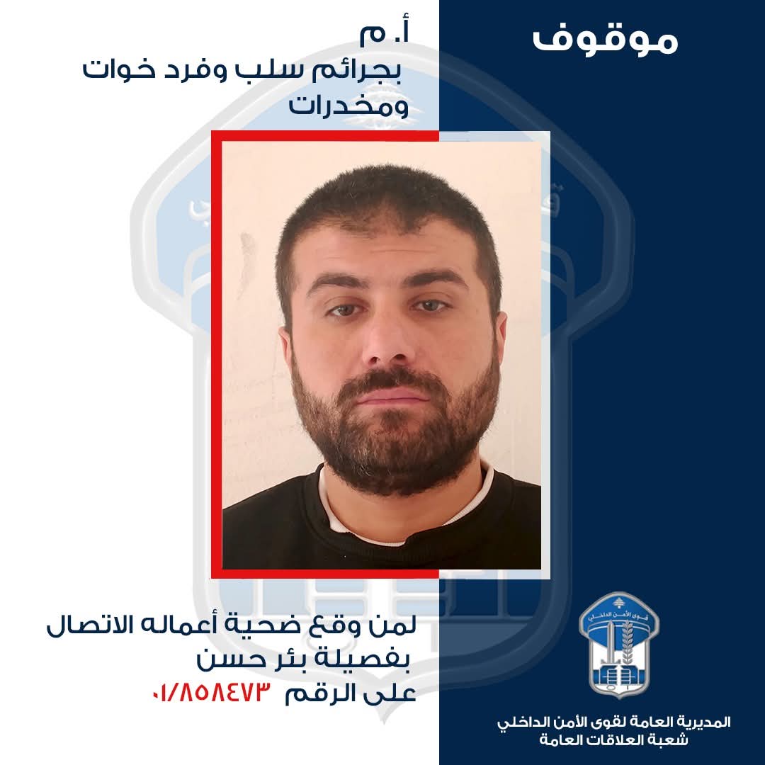 صدر عن المديريّة العامّة لقوى الأمن الدّاخلي ـ شعبة العلاقات العامّة البلاغ التّالي: تُعمّم المديريّة العامّة لقوى الأمن الدّاخلي، بناءً على إشارة القضاء المُختصّ، صورة الموقوف: أ. ع. م. (مواليد عام 1993، لبناني) لإقدامه على عمليات سلب وسرقة وفرض الخوّات وتعاطي المخدّرات لذلك، تُعمِّم المديريّة العامّة لقوى الأمن الدّاخلي، بناءً …