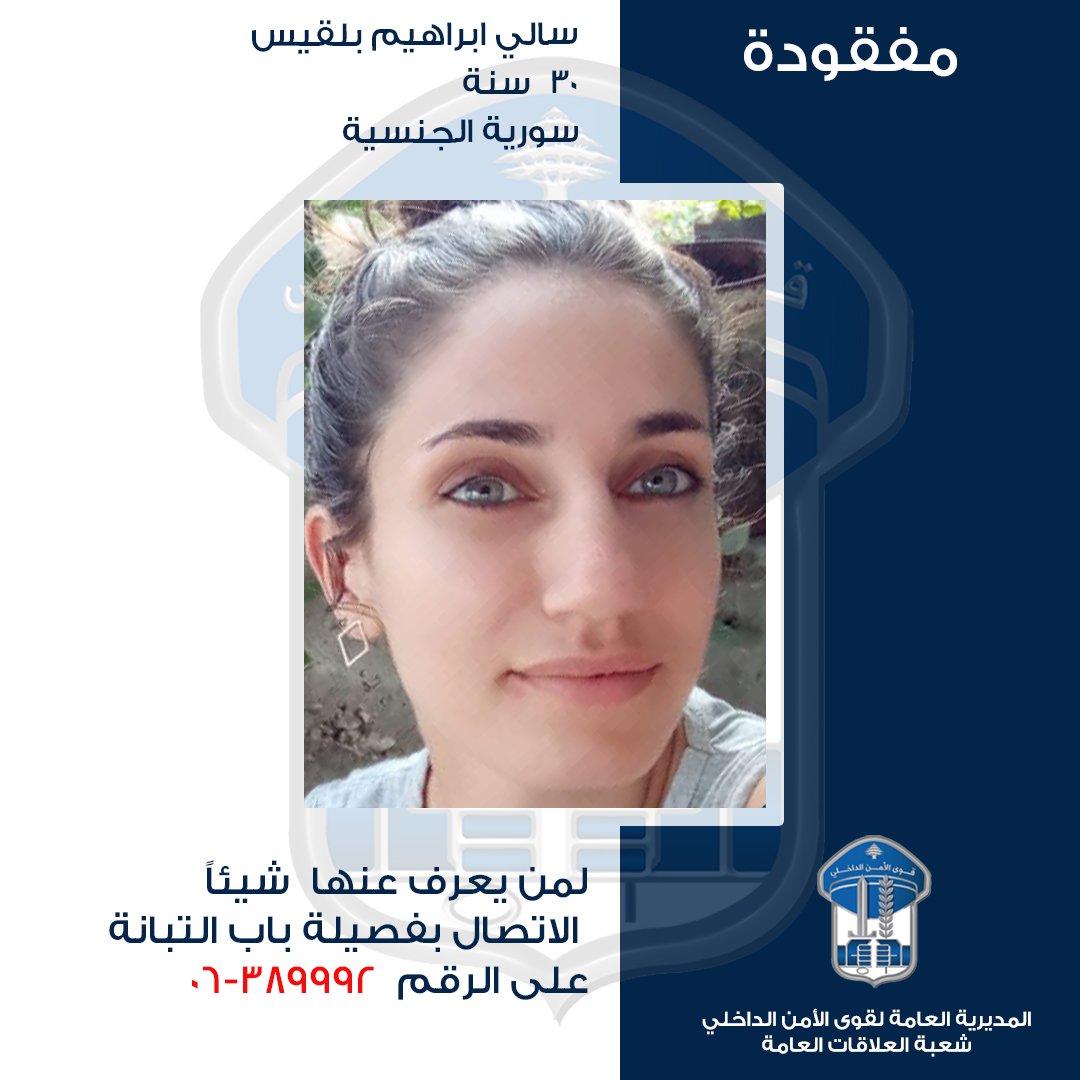 صـدر عـن المديريـّة العامّة لقوى الأمن الدّاخلي ـ شعبة العلاقـات العامّـة، بلاغ جاء فيه: “تُعمِّم المديريّة العامّة لقوى الأمن الدّاخلي بناءً على إشارة القضاء المُختصّ صورة المفقودة: سالي ابراهيم بلقيس (مواليد عام 1995، سورية الجنسية)، والتي غادرت منزلها الزوجي الكائن في محلّة التبانة – حي المهاجرين بتاريخ 17-06-2025 إلى جهة …