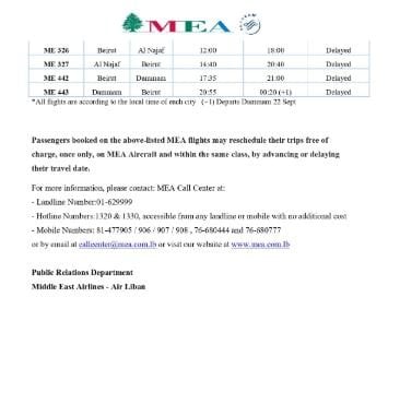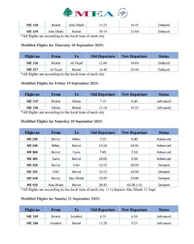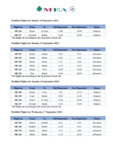 أعلنت شركة طيران الشرق الأوسط – الخطوط الجوية اللبنانية أنّه، ولأسباب تشغيلية، سيتم تعديل جدول مواعيد عدد من رحلاتها من وإلى كل من: نيس، ميلانو، أثينا، إسطنبول، القاهرة، أبو ظبي، الدمام، أربيل، والنجف، وذلك خلال الفترة الممتدة بين الخميس 11 أيلول 2025 والأحد 21 أيلول 2025.