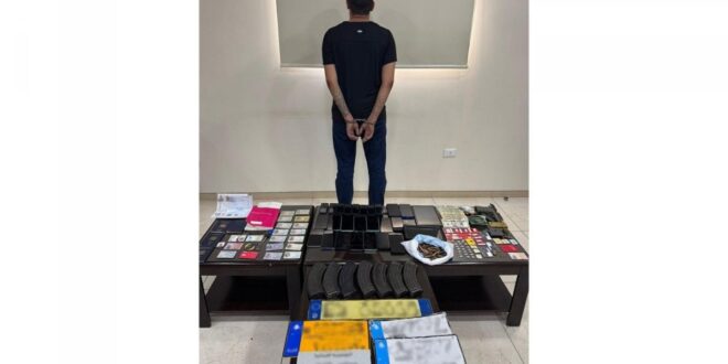 وتابع: “بتفتيشه والسّيّارة، عُثر بحوزته على مسدّس حربي مع مماشط وطلقات، وبندقيّة كلاشينكوف، ومبلغ مالي، و23 هاتفًا خلويًّا مزوّدًا بشرائح اتّصال، إضافةً إلى مستندات وأوراق ثبوتيّة تعود لعددٍ من الفتيات، وبطاقة هويّة مزوّرة، ولوحات سيّارات”.