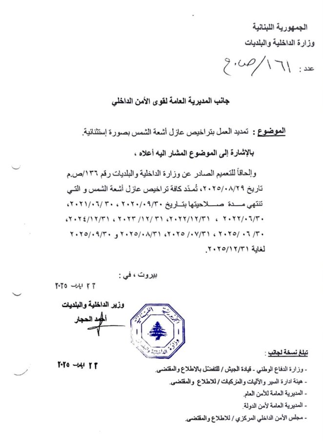 الداخلية: تمديد العمل بتراخيص عازل أشعة الشمس سبتمبر 23, 2025 186 زيارة أصدر وزير الداخلية والبلديات أحمد الحجار قراراً قضى بتمديد العمل بكافة تراخيص عازل أشعة الشمس التي تنتهي صلاحيتها في 30 أيلول 2025، لمدة ستة أشهر إضافية اعتباراً من 1 تشرين الأول 2025 ولغاية 31 آذار 2026، وذلك بصورة استثنائية.