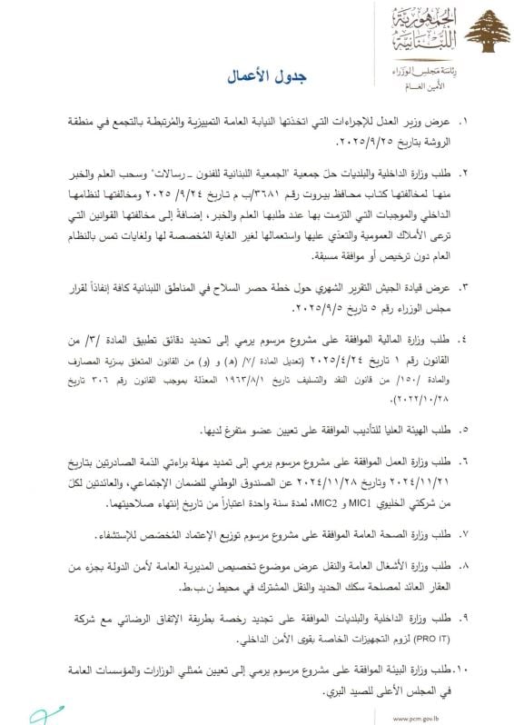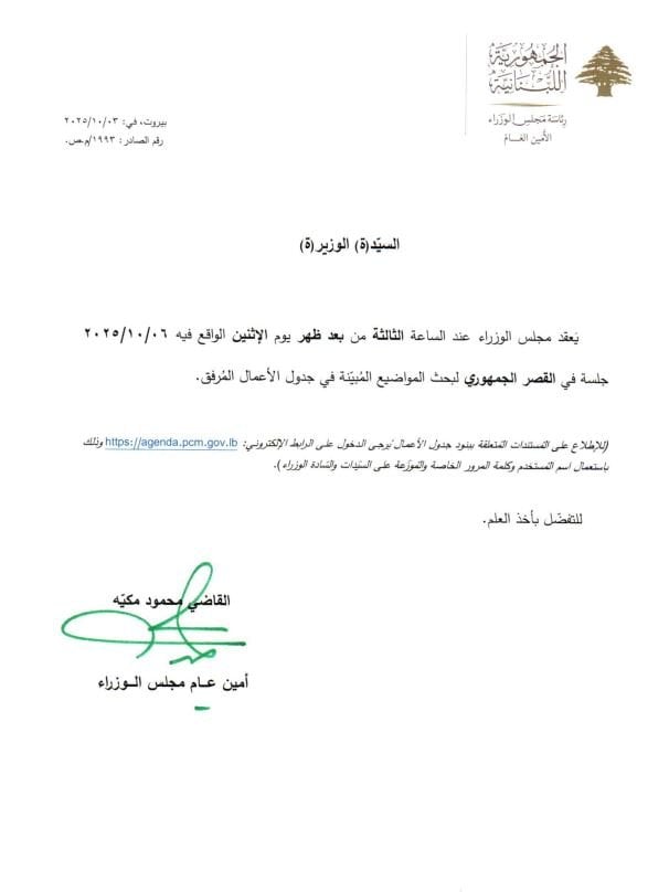 جلسة مرتقبة للحكومة… إليكم جدول أعمالها أكتوبر 3, 2025 126 زيارة يعقد مجلس الوزراء جلسة بعد ظهر الاثنين في 6 تشرين الاول 2025 عند الساعة الثالثة في القصر الجمهوري، لبحث جدول أعمال يتضمن ملفات هامة. جدول الأعمال تجدونه في الصور أدناه.