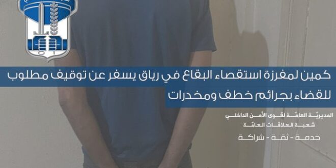 صدر عن المديريّة العامّة لقوى الأمن الدّاخلي – شعبة العلاقات العامة، اليوم الثلاثاء، البلاغ التّالي: “في إطار المتابعة المستمرّة التي تقوم بها قطعات قوى الأمن الداخلي لمُلاحقة وتوقيف المطلوبين للقضاء في مختلف المناطق اللبنانيّة”.