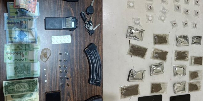 وتابع, ضُبط بحوزته: مسدس حربي مع 12 طلقة صالحة للاستعمال، جهاز لاسلكي، كمية من مادة حشيشة الكيف، حبوب مخدّرة، ظرف ترامال، هاتف خلوي ومبلغ مالي, وكما تم ضبط الدراجة التي كان على متنها من نوع “Sweet” لون أبيض دون لوحات.