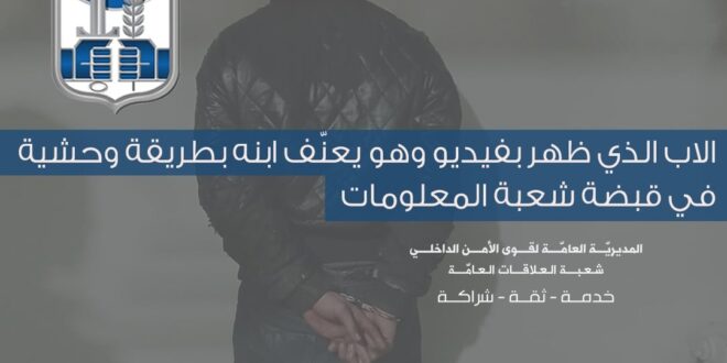صـدر عن المـديريّة العـامّة لقـوى الأمـن الـدّاخلي ـ شعبة العـلاقات العـامّـة، اليوم الخميس، بلاغا جاء فيه: “انتشر على مواقع التواصل الاجتماعي فيديو يظهر أحد الاشخاص يتعرض بالضرب المبرح لطفله. على الفور وبعد المتابعة الحثيثة تمكنت دورية من شعبة المعلومات من توقيفه في محلة سعدنايل-البقاع ويدعى ( ع.ع مواليد 1993 سوري الجنسية)”.