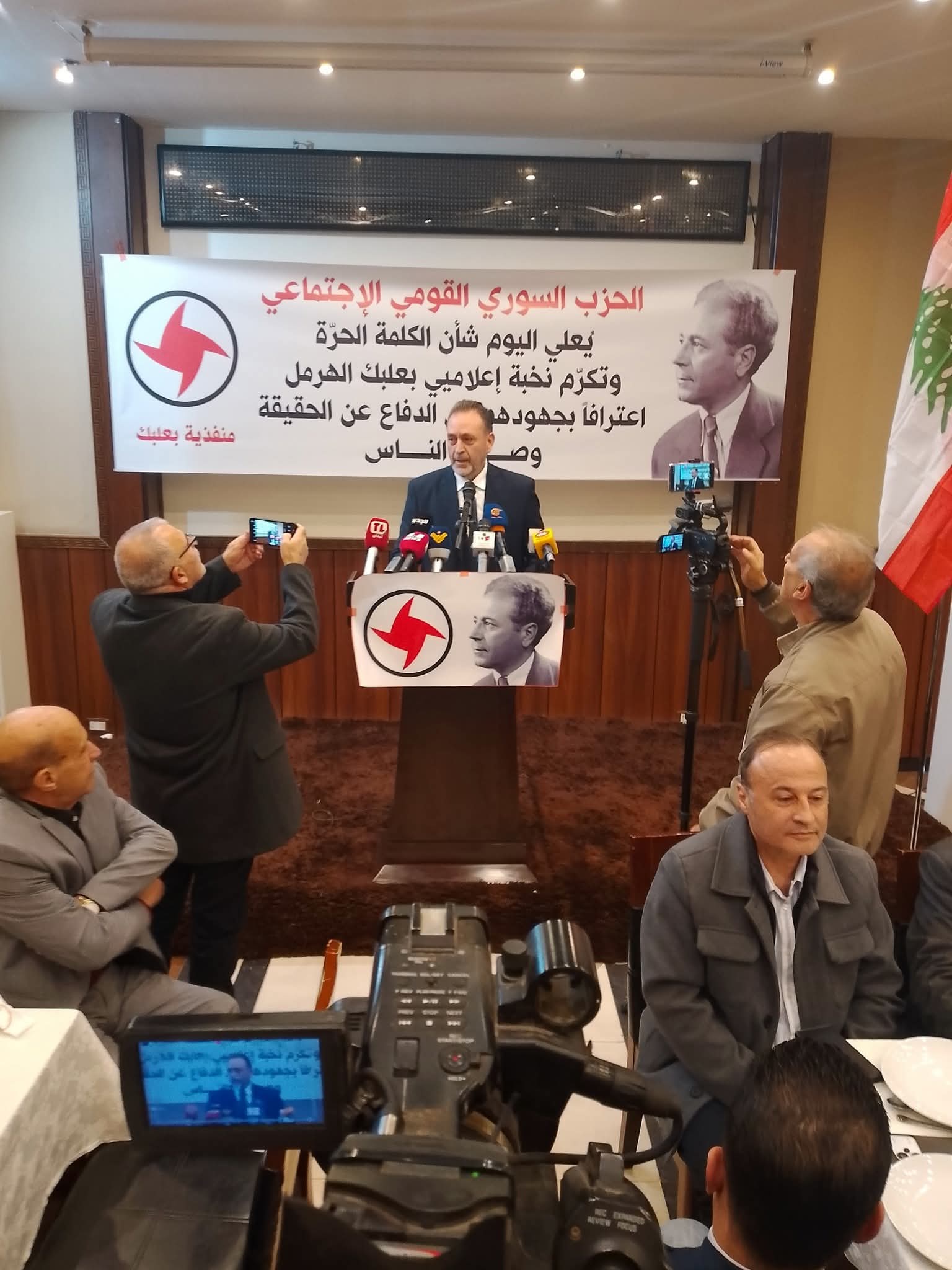 استهلّ منفذ بعلبك الرفيق حسين الحاج حسن الكلمات، مشيداً برسالة الإعلاميين ودورهم في صناعة الوعي المجتمعي، ثم ألقى الدكتور جورج جريج، عضو المجلس الأعلى للحزب السوري القومي الاجتماعي، كلمة شدّد فيها على أهمية الإعلام الحر وصون الحقيقة والحفاظ على الهوية القومية في زمن الصعاب.