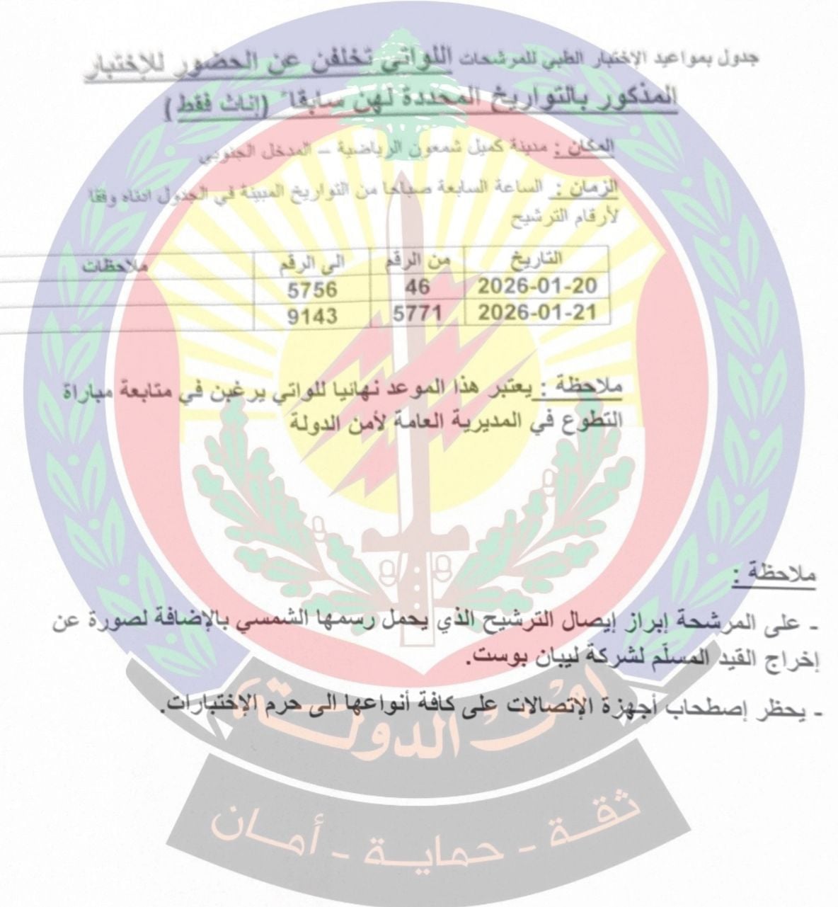 صدر عن المديرية العامة لأمن الدولة – قسم الإعلام والتوجيه والعلاقات العامة، بيان جاء فيه: “إلحاقًا لبيانها السابق المتعلّق بمواعيد الاختبار الطبي للمرشّحات المتطوّعات لرتبة مأمور متمرّن (إناث فقط)، تعلن المديرية العامة لأمن الدولة عن جدول جديد بمواعيد الاختبار الطبي للمرشحات اللواتي تخلّفن عن حضور الاختبار المذكور بالتواريخ المحددة لهن سابقاً (إناث فقط)، في مدينة كميل شمعون الرياضية – المدخل الجنوبي، عند الساعة السابعة صباحًا، وذلك وفقًا لأرقام الترشيح والتواريخ المذكورة أدناه”.